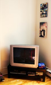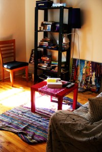 This is our living room. Like the other rooms in our home, it isn’t big, but what it lacks in size, it makes up in height and cachet. This means that we’ll be using these tall walls by adding lots of shelving in order to store our (quickly growing) collection of books, DVDs and random deco items. I’ve commissioned a huge built-in style bookshelf to be assembled by my step-dad. It will replace the precariously standing unit we have right now. Good thing we don’t live in an area with strong seismic activity because that thing is so unstable that I’m scared it’ll drop any time I even so much as walk next to it!