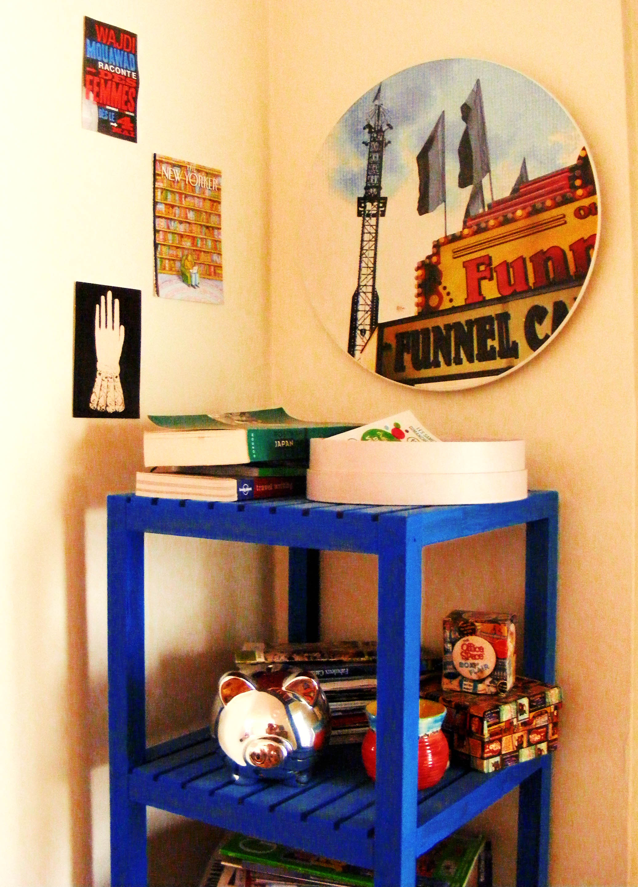 The chosen color scheme of the room is a dominant of white with fushia, yellow, blue and black accents. This is reflected in the mural that I painted on the back wall a few months back. When we visited the place, as soon as I spotted this huge piece of wall, I knew it would be covered in art. I had a few designs in mind but I ended up choosing to replicate a drawing I’d done six years ago, that I’d always kept because I loved the look of it. It represents a funky, lively view of a modern city, with highrise buildings that are more Hundertwasser then Rockefeller.